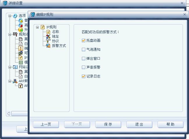 都可以在防火墙的IP规则中参考2楼的设置方法,取消托盘动画或者是声音报警,只留记录日志即可.