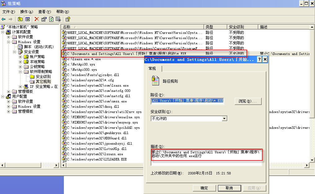 (1)用瑞星2008主动防御之“程序启动控制”或“组策略”中的“软件限制策略”禁止C:\Documents and Settings\All Users\「开始」菜单\程序\启动\netguy_updatefile.exe运行。
