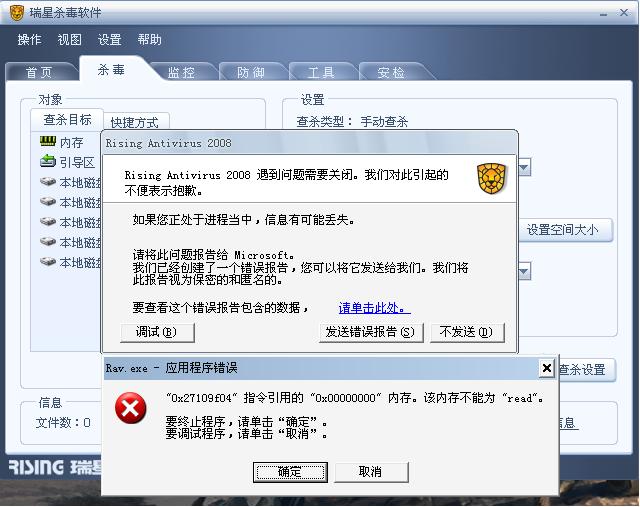 我的瑞星出了问题,无法全盘杀毒,一杀毒就弹出错误,监控也无法开启,可以升级程序,重装也不起作用
