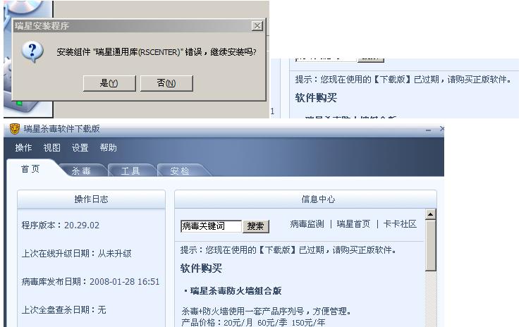 下面是我装瑞星时出现的情况:每次安装都会出现一个窗口,说什么瑞星通用库错误,