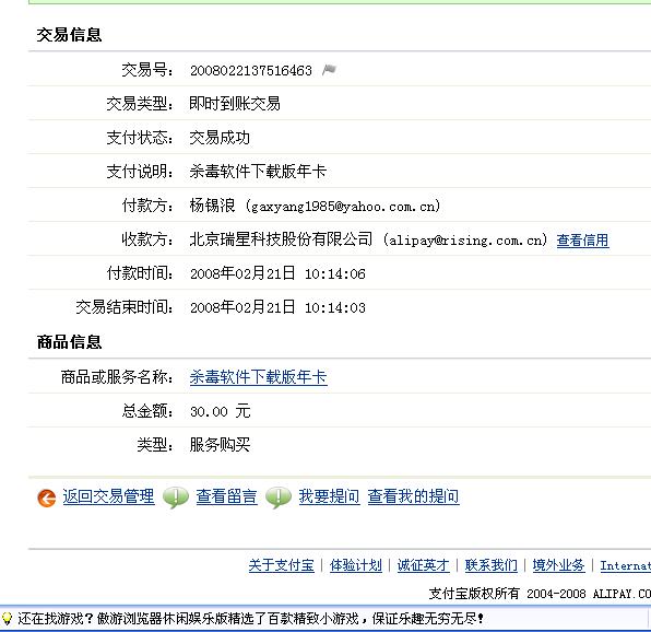 我在2008年02月21日上午10:14:06 通过银行卡支付宝购买"杀毒软件下载版年卡",但是到今天了邮箱里还没有收到,相关邮件,这怎么回事??