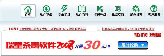另外,360是怎么火起来的,大家应该都知道吧?就是同卡巴斯基捆绑在一起,利用卡巴斯基的免费得以推广的。而卡巴和瑞星是最直接的竞争对手,360现在开始卖广告了,想钱想疯了,竟然连瑞星的广告也接,惟利是图之心大白天下(瑞星在360的广告见上图)
