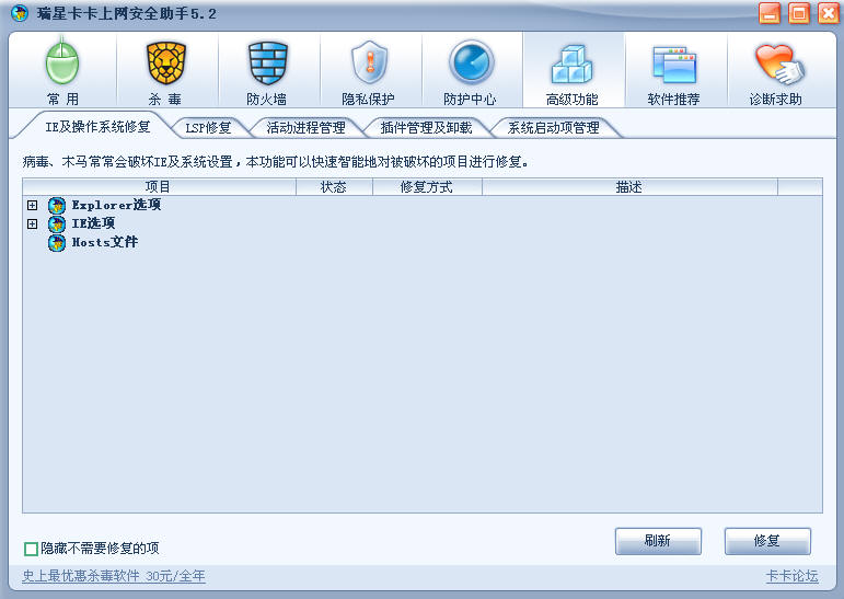 6.增加了“lsp修复”,把以前的winscok修复单独提出来。还增加了“隐藏不需要修复的项”。