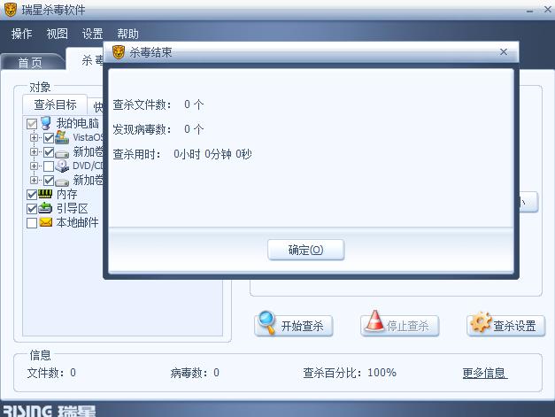 很快 瑞星弹出结果:查杀文件数0 发现病毒数0 查杀用时0小时0分0秒 其中停止查杀的键是黑的 已经好久这样了