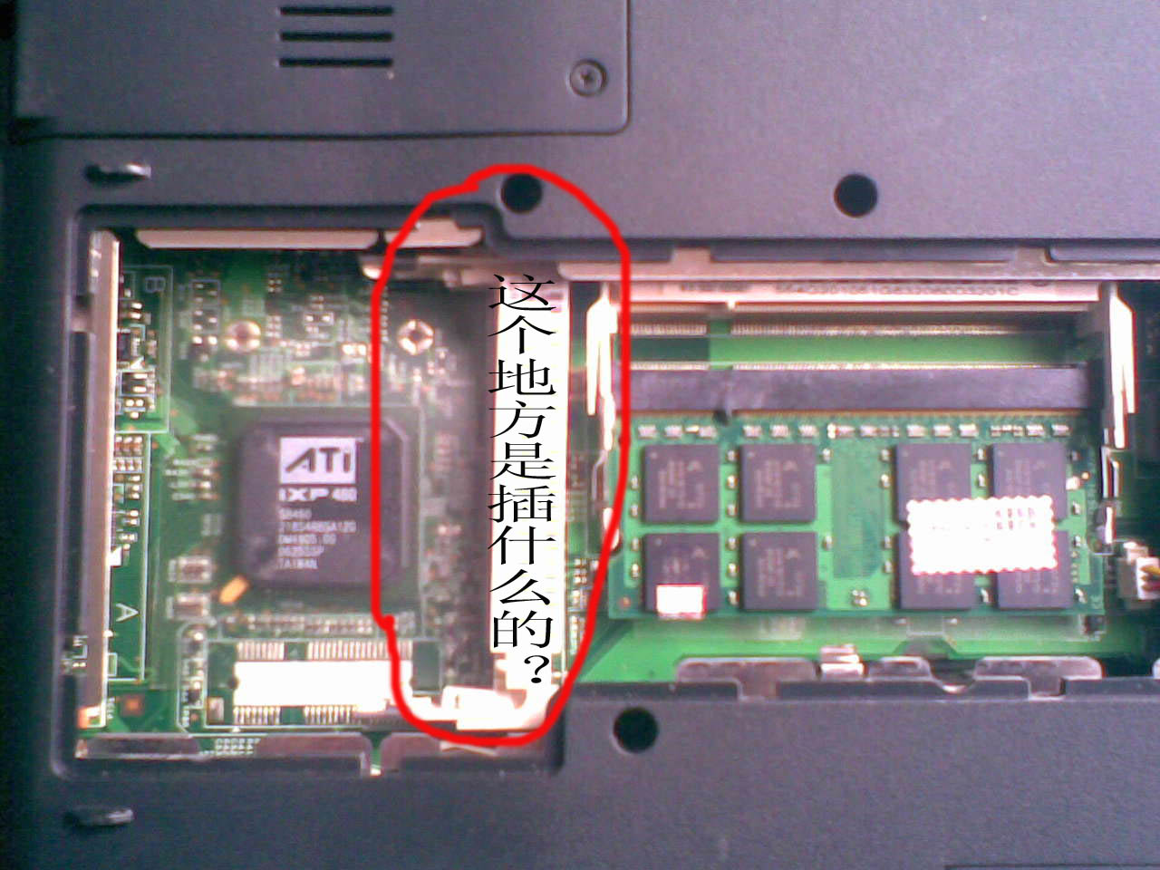 这是我笔记本底部图片,我知道右边是插内存的,但是我不知道我用红线圈起来的地方是插什么的,我看见那个地方也有个插口 , 有知道的请 告诉一声,谢谢
