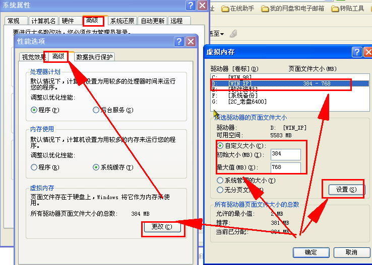 虚拟内存的设置鼠标指到“我的电脑”击右键→“属性”→“高级”→“性能”→“设置”→“高级”→“更改”→参见下图红框中所示