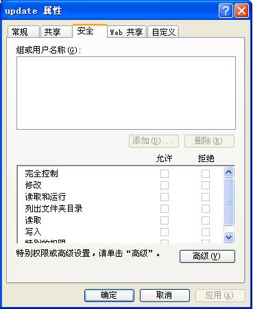 第一个图片是文件夹的图片,第二个是子文件夹update属性,点击安全就会弹出这个对话框,第三个图片是点击确定后查看的update的安全属性。