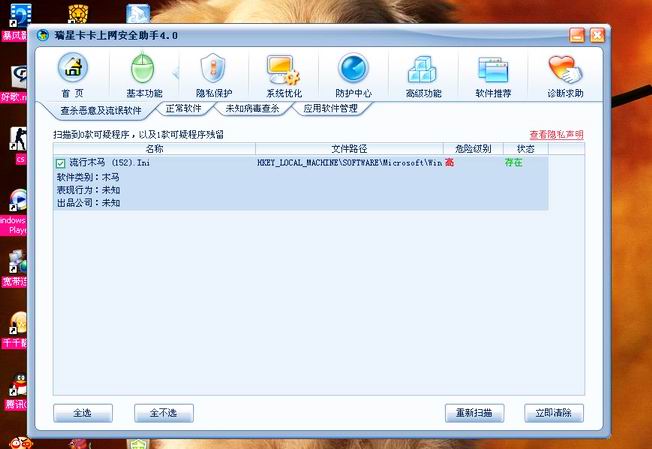 我的卡卡还能开,关键是瑞星开不了,进程里还是有两个一样的,专杀之后可以保持一段时间的正常,重起电脑又复活
