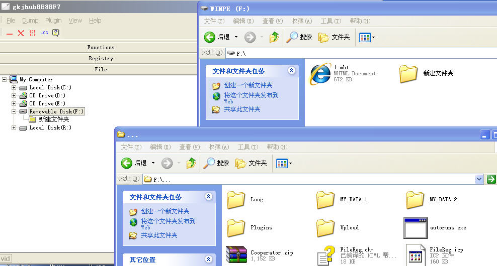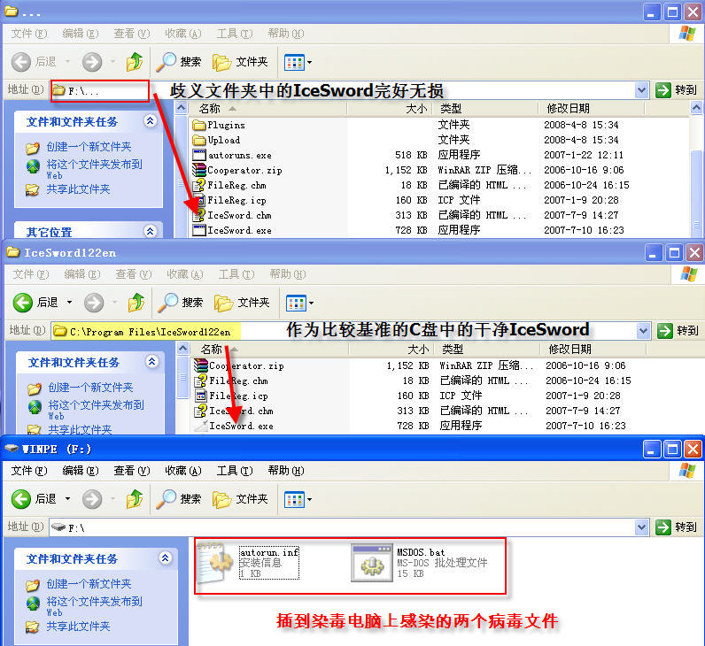然后,将此U盘插到干净电脑(已禁止自动播放)的U口上,比对此文件夹中的IceSword(图2上)与未染毒电脑中的IceSword(图2中)——————二者完全相同。