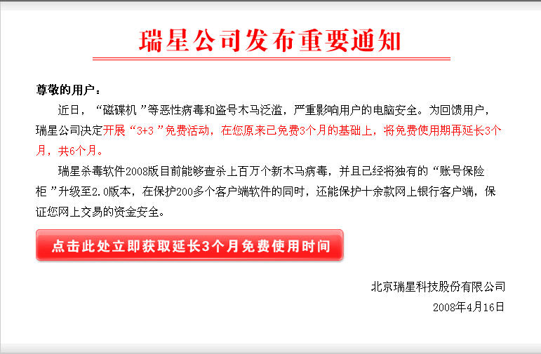 原来真的是免费的啊~刚吓死我了,在上网时忽然跳出一个窗口说可以再免费三个月,一开始没反应过来,心想这是真的吗?不会是病毒什么的吧?然后看到桌面右下角显示瑞星在升级,点了一下,可是刚才那窗口忽然又显示说我已经完成升级,成功延长使用三个月,我想我都还没点呢,怎么就好了~赶紧杀毒,并到社区来看看,还好,原来是真的~额滴神啊!