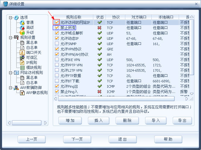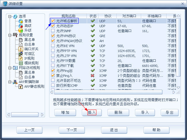 然后在左边选择“IP规则”,在右侧选中第一条规则(图中第一条是“允许域名解析”),让其成为高亮状态,然后点插入