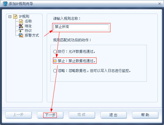 点完插入后出现一个添加规则向导,规则名称你自己任意输入,例如:禁止所有,动作选“禁止”,下一步