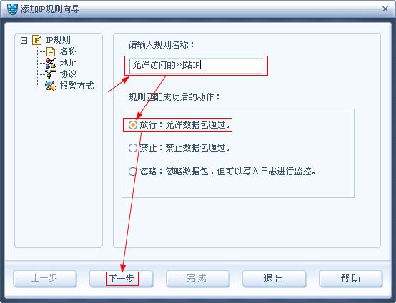 出现添加规则向导,名称任意填写,例如:允许访问的网站IP