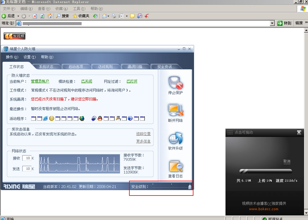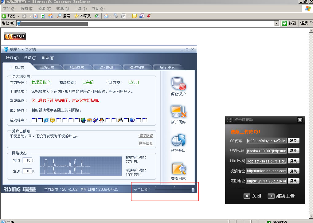 很早以前,自从我一次重新安装电脑系统后,安装完成最新版的瑞星防火墙后,使用该插件上传视频时,选择好上传文件后,进度条无反应,任务管理器显示浏览器程序的cpu占用率100%,使用IE6,IE7,傲游1,傲游2浏览器均是如此.