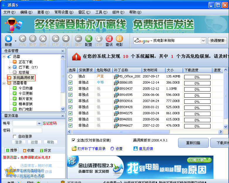 最近用迅雷下载动画片的时候,无意中发现迅雷主界面左侧有个“系统漏洞修复”,我想都没想就点了,结果扫描出20多个系统漏洞,奇怪啊,瑞星的、QQ医生建议打的漏洞我都打上了,怎么还有这么多“紧急”的没打啊?