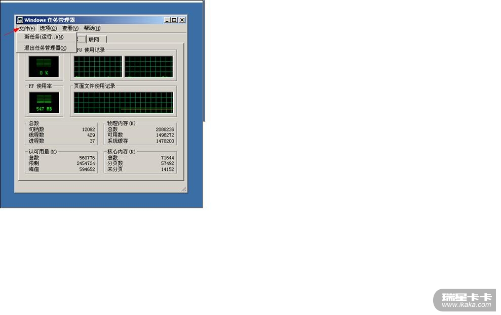 2、同时按下键盘CTRL +ALT+DEL键,调出任务管理器,点击【文件】,如图: