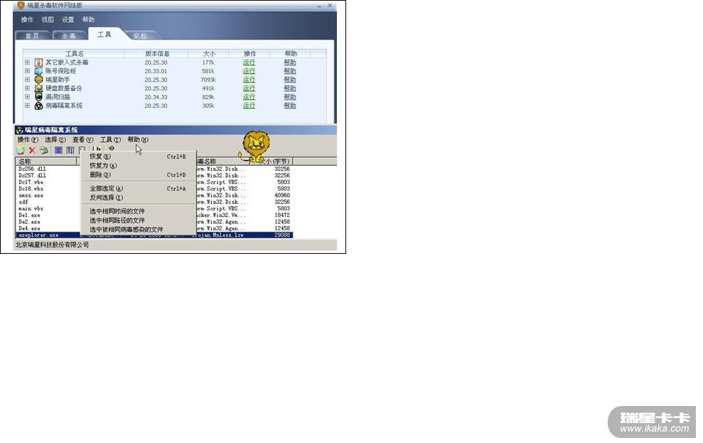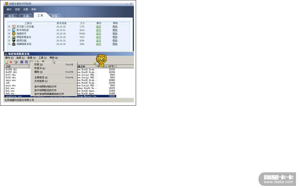 5、在瑞星病毒隔离系统的【原路径】一栏下查找路径为c:\windows\ system32\dllcache\和c:\windows\的explorer.exe文件,分别鼠标右键点击该文件,在弹出的菜单中选择恢复,如图。