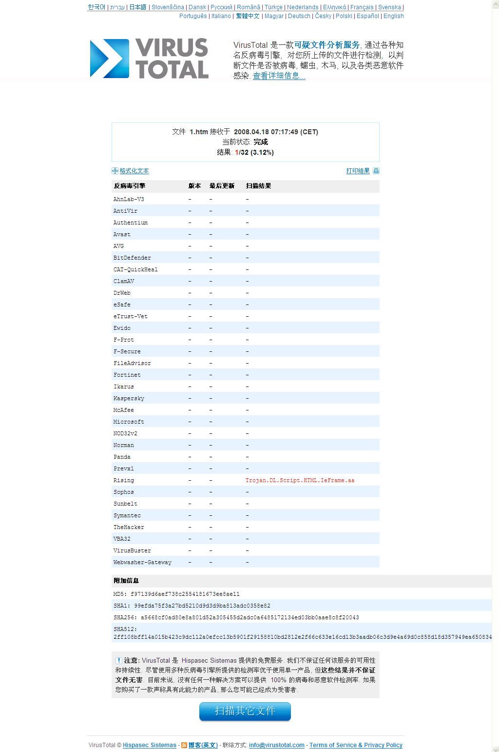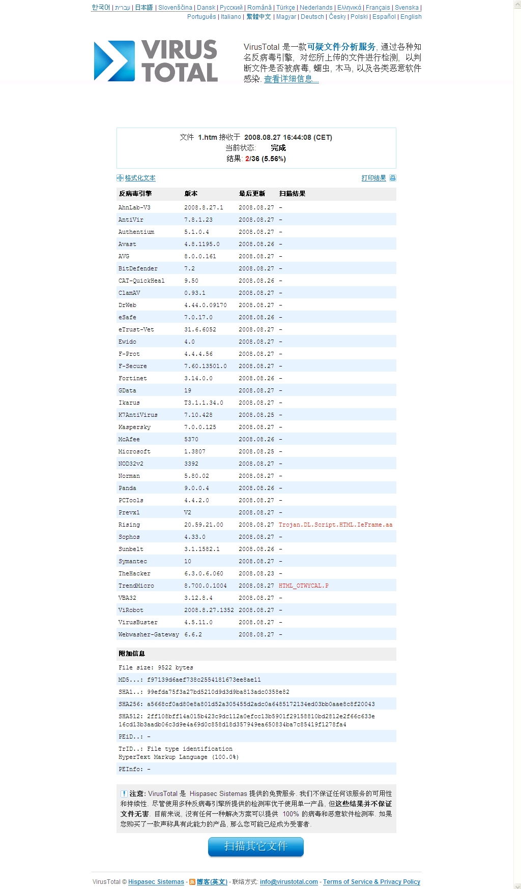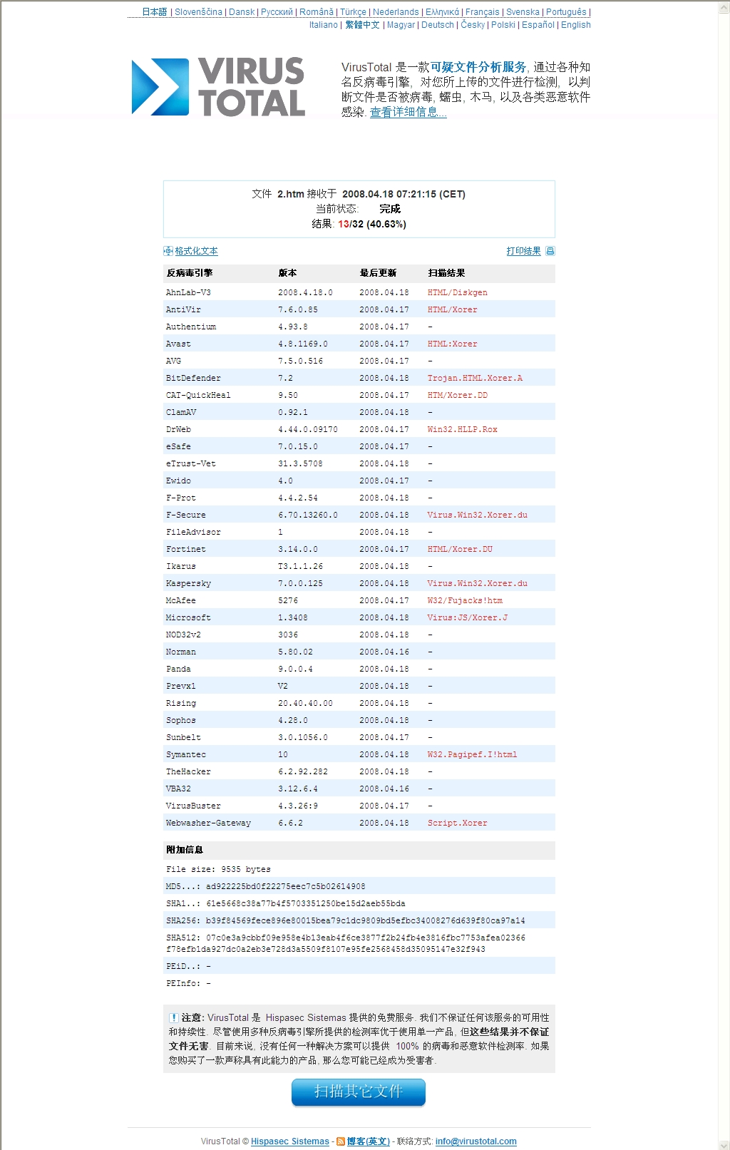 我的U盘中,所有的htm文件都中毒了(这点我很确信,有疑问我有N多证据),但是瑞星不报毒(这类文件简称A类文件);用其它杀软报毒,用其它杀软杀毒后的文件(简称B类文件)。