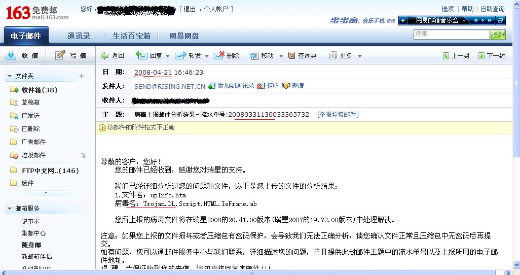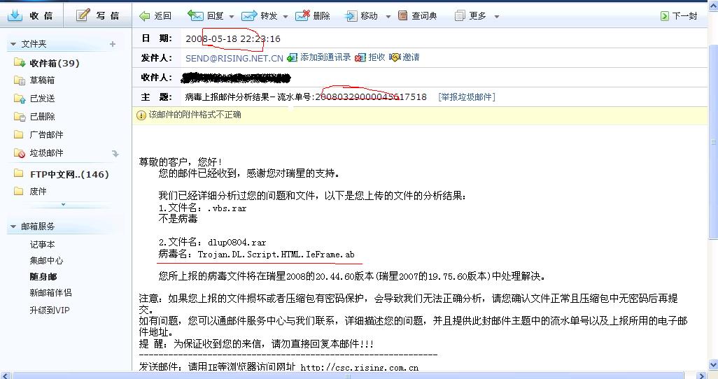 看来我上报的文件,是在遗漏了一个多月后被瑞星工程师从垃圾堆里发现的~~