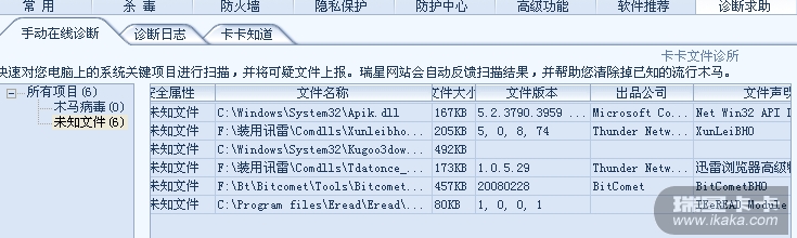 唉`~~!一个字。闷。 QQ被盗~!瑞星又装不了。邮箱未读邮件无法打开。QQ软键盘无法使用。。。。。。。。下面是卡卡 扫描出来的。可是无法删除,,,,没有连上网络之前是。。扫描结果