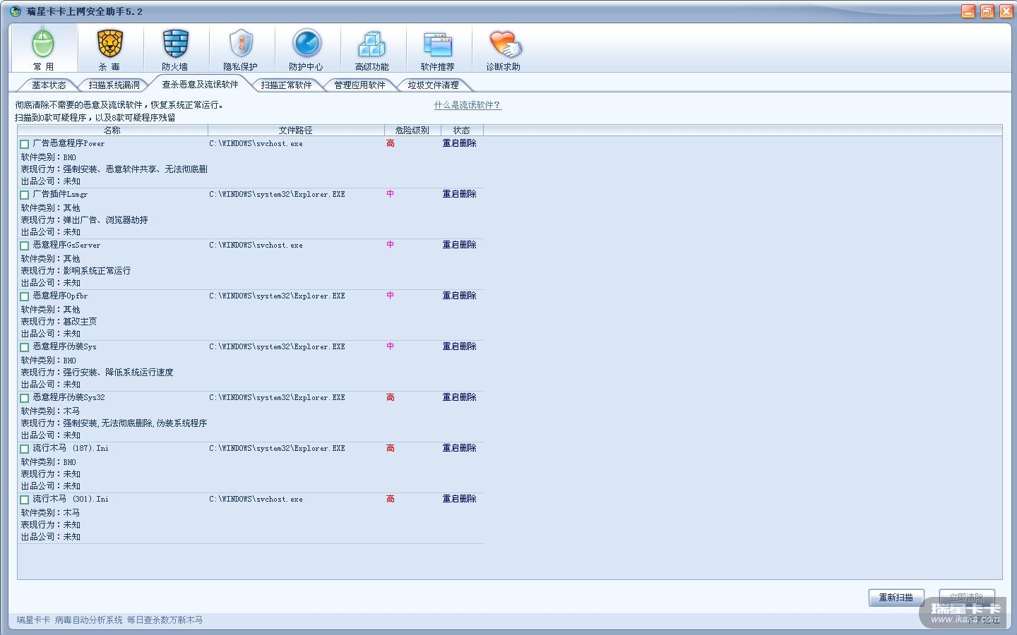 我的电脑中用卡卡查出8个木马,说是重启后删除,我这样重复操作了三天,到现在为止怎么查那8个还是在我的电脑中。真不知道卡卡到底管什么的。