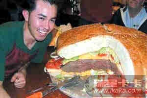 这个巨型汉堡叫做“Ye Olde 96er”,在宾夕法尼亚州的一个酒吧里它售价是12.95欧元。“大块头”汉堡里夹着一块3公斤重的牛肉片、一片2.5公斤的干酪,在最顶上还插着一个巨大的圆面包。