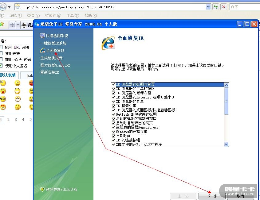 使用瑞星卡卡助手+360安全卫士检测系统是否存在恶意插件程序对IE的干扰。