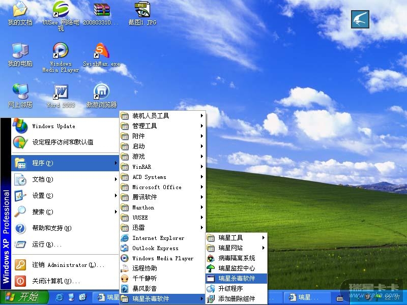 原来用7.5版正常。我今天重装电脑公司8.5或者9.0XP系统后,安装正版瑞星杀毒软件无法使用。但是监控小绿伞和账号保险柜2.0正常,桌面截图如下: