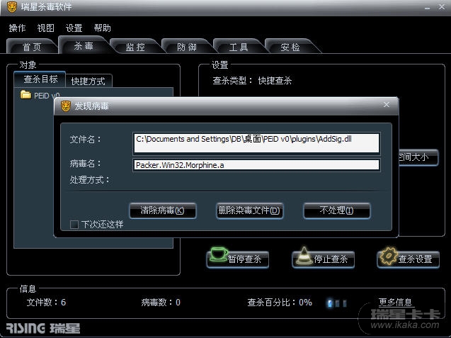 今天在搜狗上下载了个pied0.94汉化版查壳工具,扫描压缩包的时候发现瑞星只能扫描到一个文件并且没有报毒