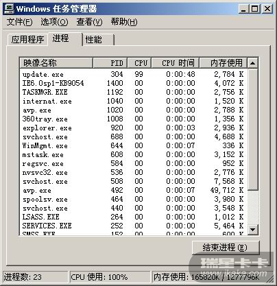 见附件的图中,我的系统是Windows2000+SP4,在安装IE6的补丁时update.exe进程占用了CPU 99%,导致系统死机,平时只要不安装补丁就挺好,一装就死,不仅仅是这个个IE6的补丁。