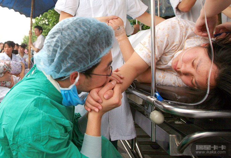 5月12日,四川汶川发生7.8级地震,成都地区震感明显。成都锦江区妇产科医院在地震后将即将生产的产妇转移到了室外,这位丈夫给妻子送上深情一吻,陪伴着妻子。