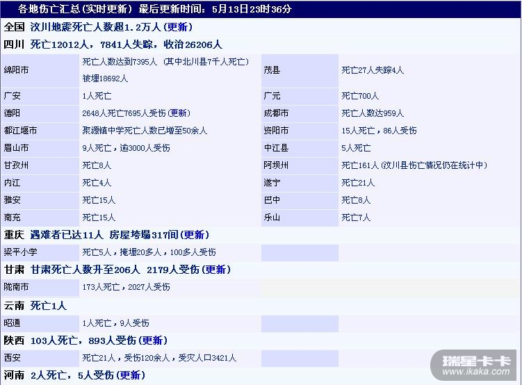 各地伤亡汇总(实时更新) 最后更新时间:5月13日23时36分