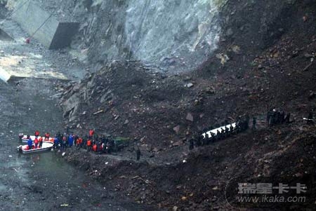 5月13日,解放军某部官兵和成都武警官兵正在位于都江堰市与汶川县交界处的紫坪铺大坝下面,设法利用冲锋舟从水路进入汶川县映秀镇进行紧急救援。