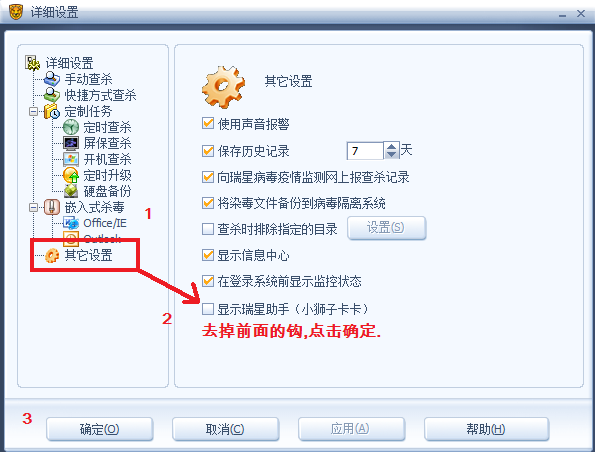 在右面的选项里找到 显示瑞星助手(卡卡小狮子) 把钩去掉