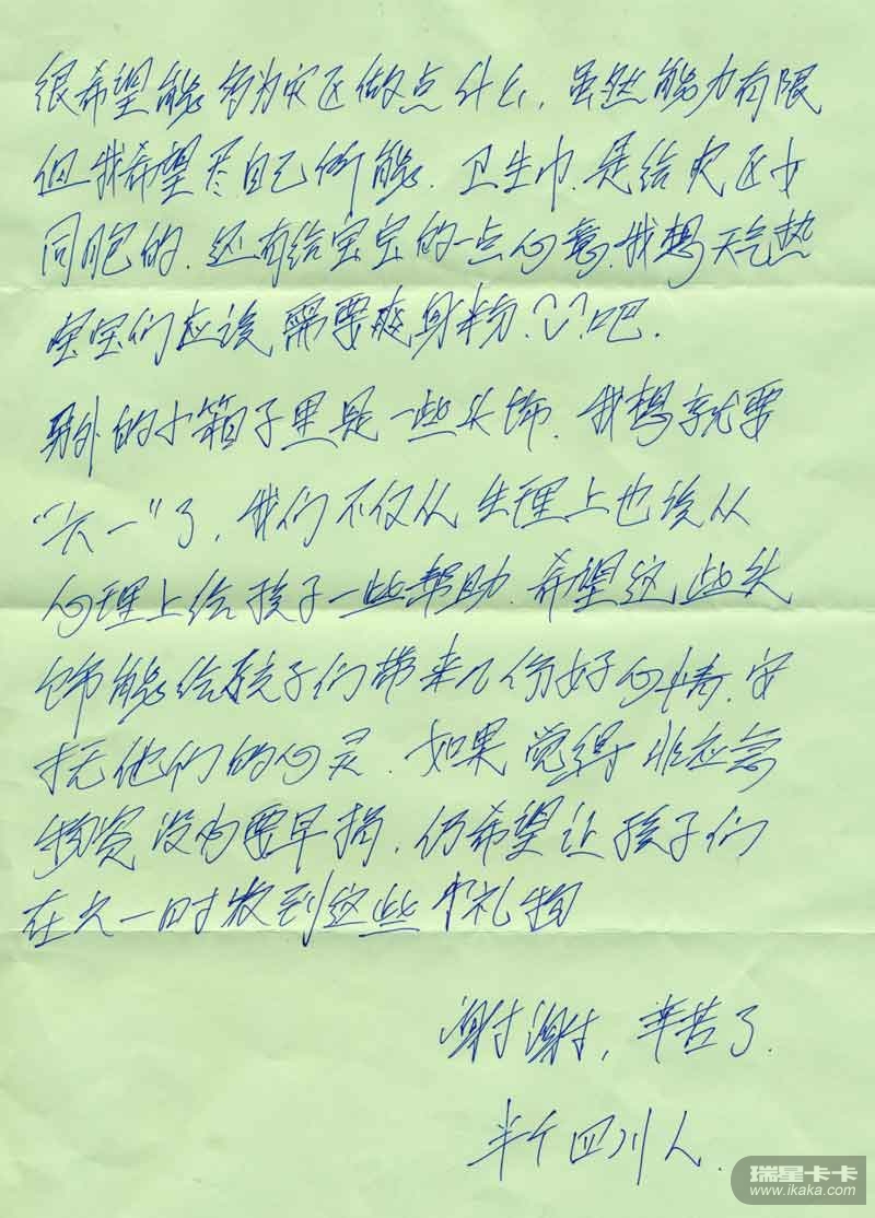 很希望能多为灾区做点什么,虽然能力有限,但我希望尽自己所能。卫生巾是给灾区女同胞的,还有给宝宝的一点心意,我想天气热宝宝们应该需要爽身粉。是吧。另外的小箱子里是一些头饰,我想就要“六一”了,我们不仅从生理上,也该从心理上给孩子一些帮助,希望这些头饰能给孩子们带来几分好心情,安抚她们的心灵。如果觉得非应急物资没必要早捐,仍希望让孩子们在“六一”的时候收到这些礼物!谢谢,辛苦了。半个四川人正如这个不留名的好心人所言,这些物品并不是灾区最急需的物品,但为了灾区孩子们担心的那份心,却也是孩子们最需要的,不是吗?