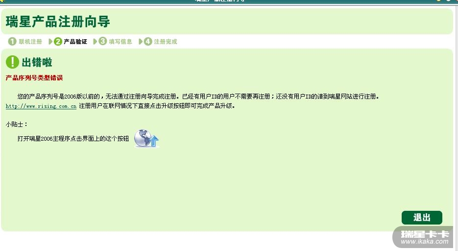 产品序列号类型错误................Ë{H7Ïï©bbs.ikaka.com©X³ cè)Ë{H7Ïï©bbs.ikaka.com©X³ cè)Ë{H7Ïï©bbs.ikaka.com©X³ cè)Ë{H7Ïï©bbs.ikaka.com©X³ cè)Ë{H7Ïï©bbs.ikaka.com©X³ cè)您的产品序列号是2006版以前的,无法通过注册向导完成注册。已经有用户ID的用户不需要再注册;还没有用户ID的请到瑞星网站进行注册。