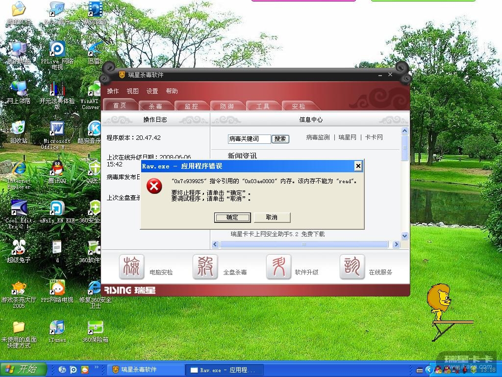 今天开电脑的时候发现瑞星图标不见了,QQ医生也被屏蔽。怀疑中了木马或者是AV终结者。赶紧下了360安全卫士查杀木马,结果杀出来有20个木马。后来QQ医生已经能够使用,瑞星的雨伞图标也出现了,但是是红色的关闭的伞。其显示监控都被禁用。但是打开瑞星,监控却显示为启用状态。然后启动瑞星升级程序,系统则跳出一个对话框,显示应用程序异常。