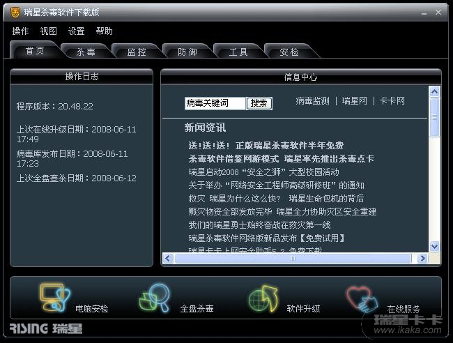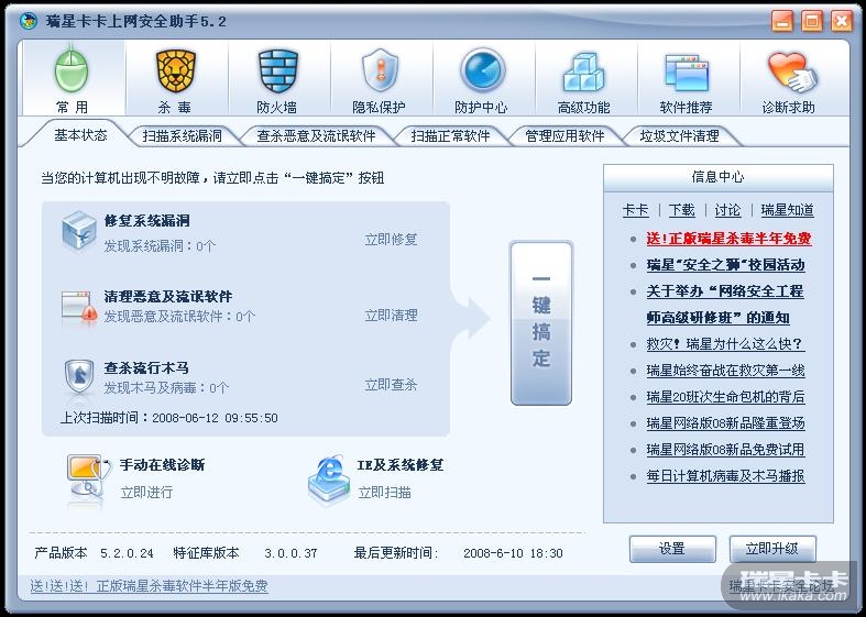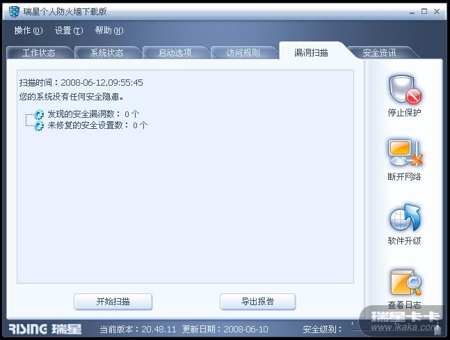 而同时用瑞星防火墙扫描漏洞和卡卡扫描漏洞,却都显示系统漏洞为0,是正常状态。