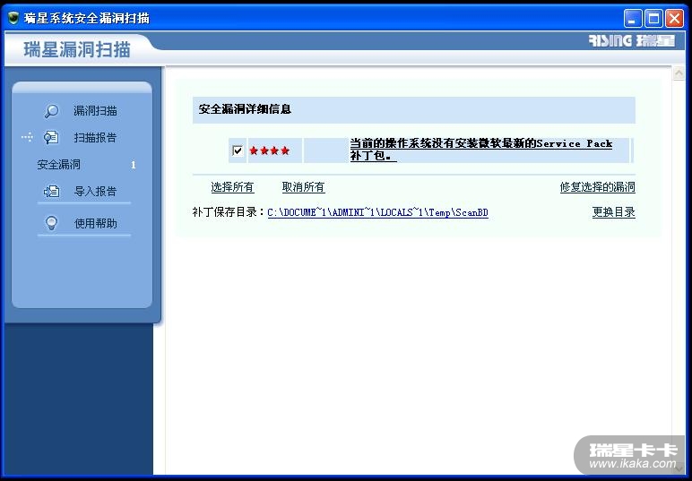 昨天开机先用瑞星杀毒软件的漏洞扫描功能进行扫描,结果显示: