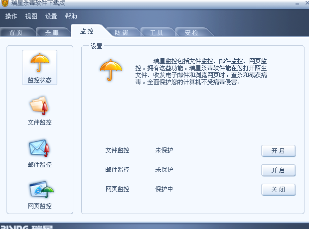 我的杀毒软件监控关闭拉,开不了啊,怎么办啊。伞变黄拉。555
