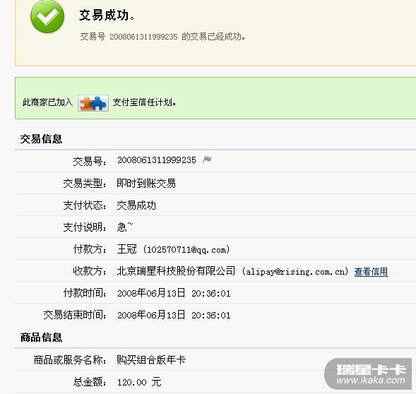 alipay@rising.com.cn的卖家转了120块,转完钱提示“交易成功”,就没啦!没给我新的序列号,什么也没有。怎么回事?我是被假公司骗了还是怎么着?