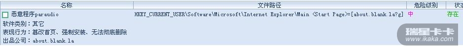 今天在绿软联盟下载软件 当时瑞星无任何反映 关闭IE过了几分钟 突然听见广告声音 而且主页被修改 自动安装了些莫名其妙的软件.... 用卡卡说无法彻底删除 PC重启后又有了 下面是卡卡的报告