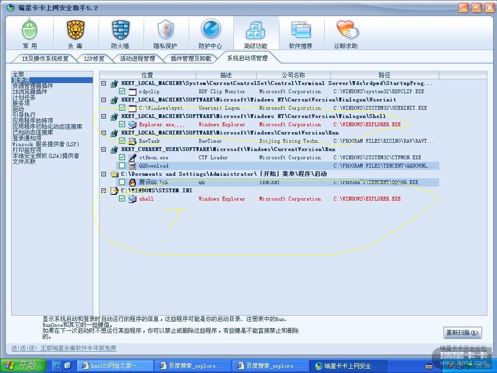 你右键点击Explorer.exe,跳转到,进入注册表后,找到Shell,右键修改,只保留Explorer.exe,其余删除