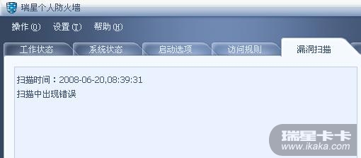 请高手帮帮忙,我用瑞星防火墙的漏洞扫描来扫描时,提示扫描中出现错误,我也找不出来是啥子错误,软件能升级就是不能对漏洞进行扫描,郁闷!请高手指点下,万分感谢!
