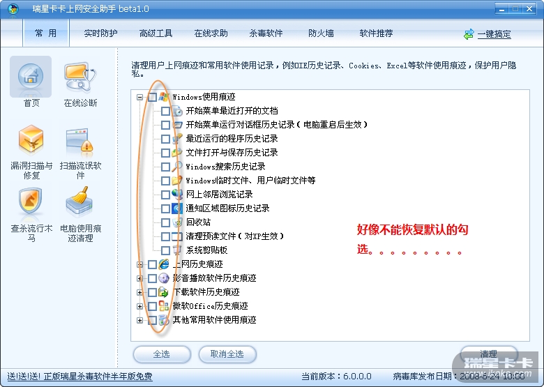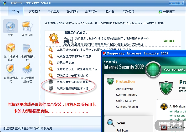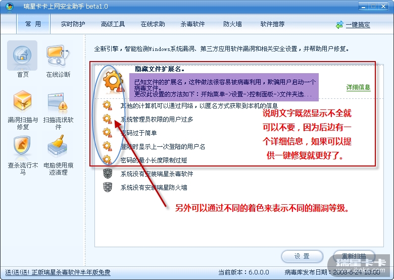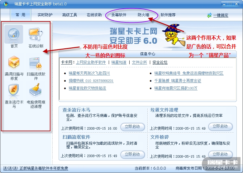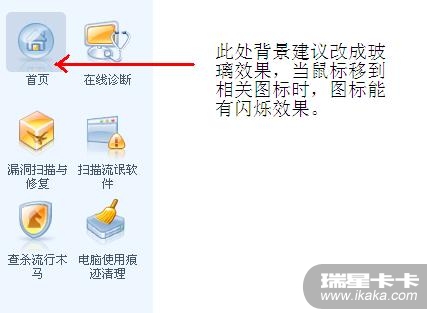左边一排我会在图标下的文字改为:卡卡首页,在线诊断,漏洞修复,木马查杀,痕迹清理,恶意软件。(这样软件也会比较整洁)