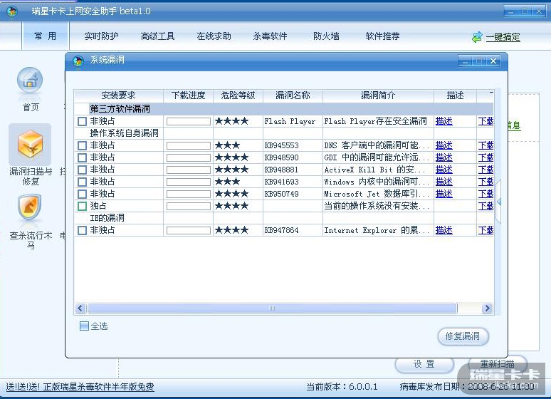 目前很对用户选择KAKA6这样的安全辅助工具最大的理由就是升级系统补丁,而瑞星老版本的补丁检测时间差过长建议改进!