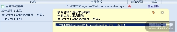 提示为盗号木马,可是卡卡搞不定,用瑞星杀毒软件又查不出病毒
