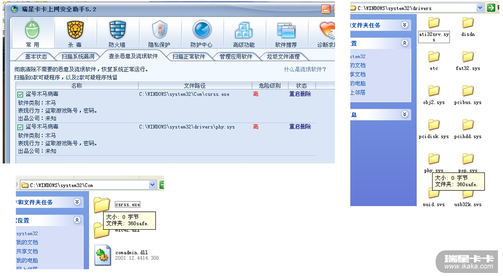 今天用卡卡上网安全助手查找流氓软件。发现有二个盗号木马病毒,在用手工删除时,提示这是360卫士,无法删除,请问是什么原因。请看图。