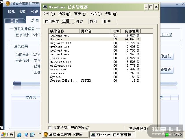 s首先谢谢你。我查了是瑞星本身占用的CPU100%其他都关掉了。在安全模式下杀毒。到几分钟后就慢下来了。一看CPU占占用100%且不变化。