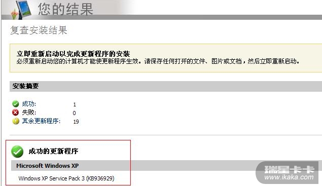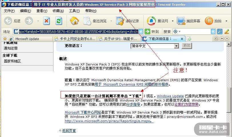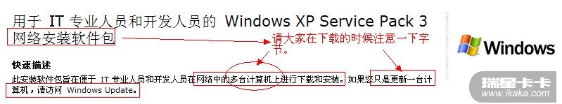 :“有人说通过瑞星卡卡下载更新sp3就不会出现进不了系统的情况,不知道是不是真的”,说到这,那些无法进入系统界面的遭遇我想应该是理所当然的,这些错误只在于当事人与卡卡的疏忽了,在此,我提醒即将要下载那个更新包的朋友们注意了,如果你的操作系统不是XP网络版的,建议不要下载,而那些已经下载,但没有安装的朋友……不要安装哦!否则后果就是...I don't know了。如果已经安装,Oh,Sorry,俺来晚了...还有还有,瑞星的工作人员尽快修改那个错误吖..如果更多的人下载并且安装那就不是很好玩的了..
